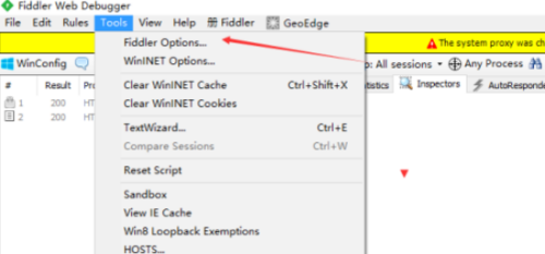 3、点击了tools 菜单之后,弹出了下拉菜单选中为 fiddler options 选项。
