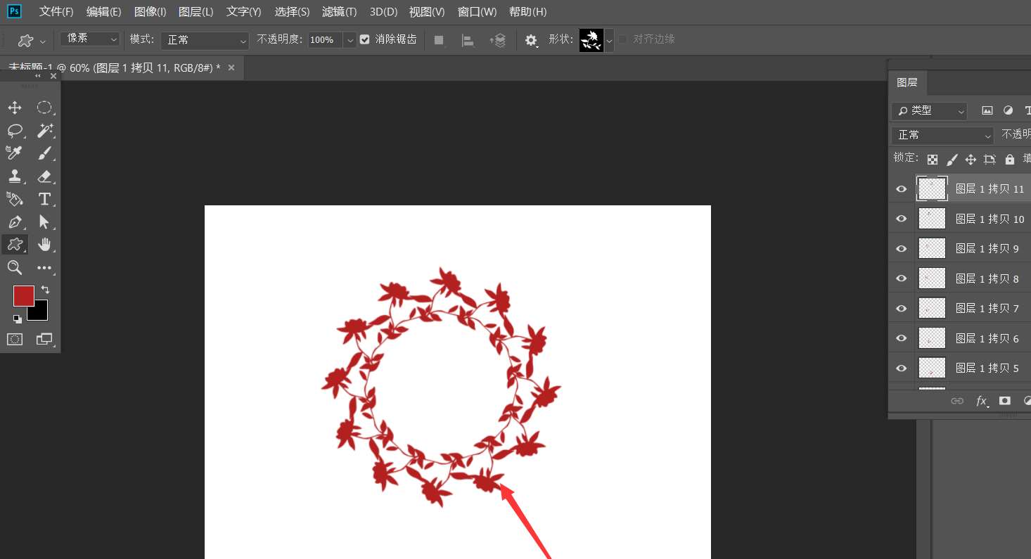 2、然后,我们新建空白图层,用自定义形状工具,设置属性为像素,在画布上画一个花朵图案。