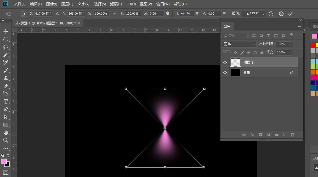 7、按ctrl+t键调节形状,然后将中心点拖动到正下方,图形旋转30度。