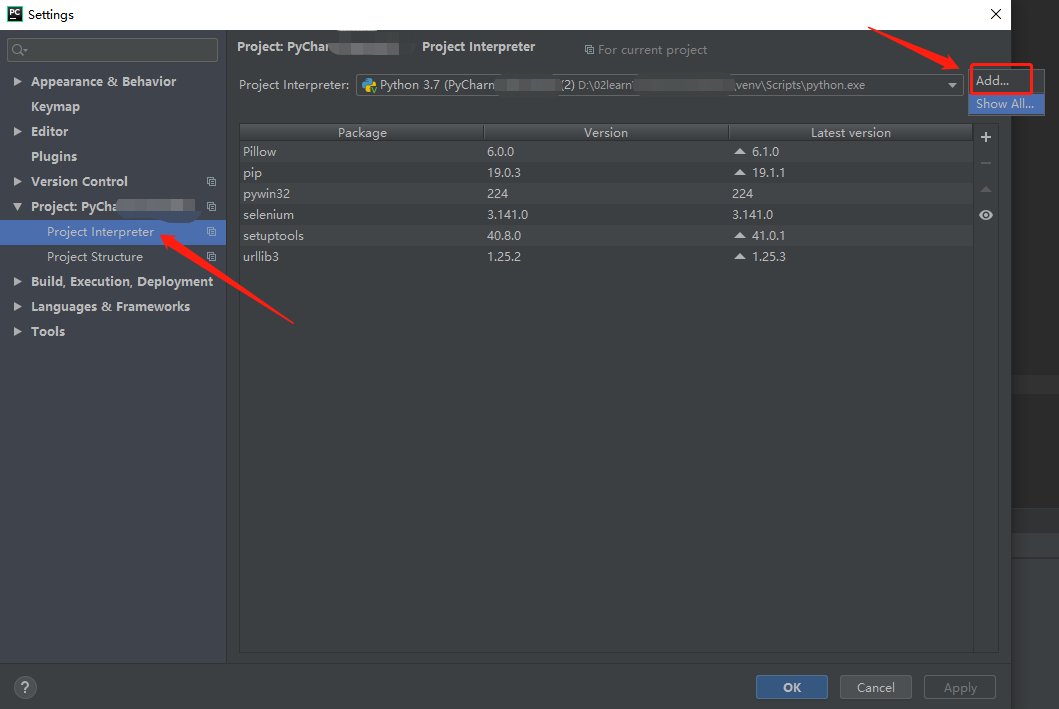 在设置弹窗中选择Project Interpreter,然后点击add;