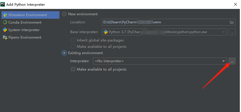 在弹窗中,选择New environment 或者 Existing environment都可以,路径选择本地配置的python.exe路径即可;