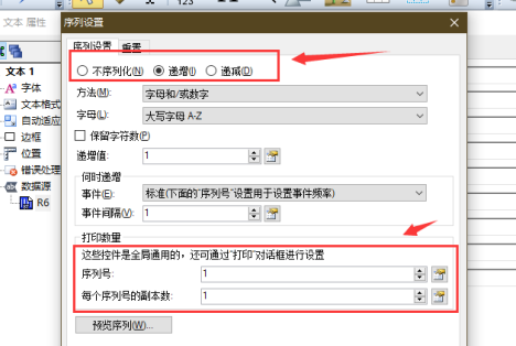 在这个页面就可以设备序列化打印了,默认为不序列化,可以选择递增或递减,也可以设置递增或递减的值,在下面的红框里还可以设置序列号和每个序列号需要打印的标签个数。设置好自己需要的参数再点击最下方的确定就设定好了。