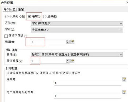 步骤3,进入序列设置中,选择递增,然后下面的默认自增量都是1(如有需要可以自己修改自增量)