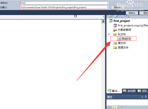 至此空项目建立完成。在右边栏(或左边栏)“解决方案资源管理器”中选择“头文件”或者“源文件”文件夹进行头文件创建,选择“添加”并选择“新建项”;