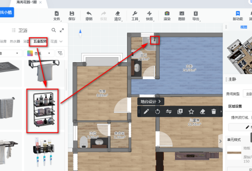 先选择洗手台将其拖入户型图,并调整大小和位置,如下图。
