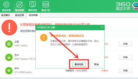 驱动卸载成功后,系统提示需要重启电脑。点击”辞忌重启电脑“。