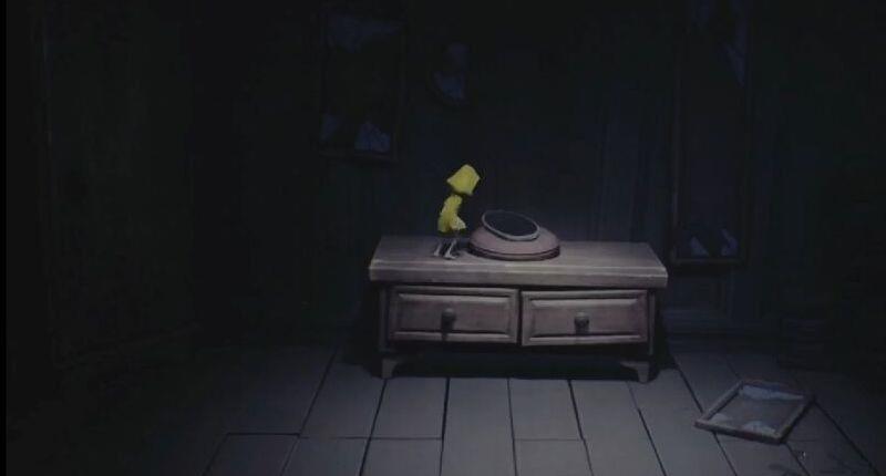 4、打开房间门后一直往里面走,可以看到有张桌子上面有反光镜,爬到桌子上把反光镜拿走。