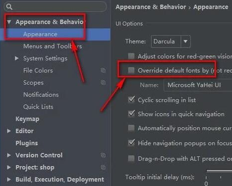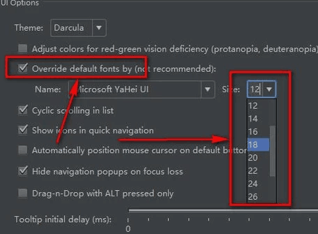 如图所示,在Appearance右边找到“Override default……”选项,先勾选上,然后就可以调整菜单的字体大小了。