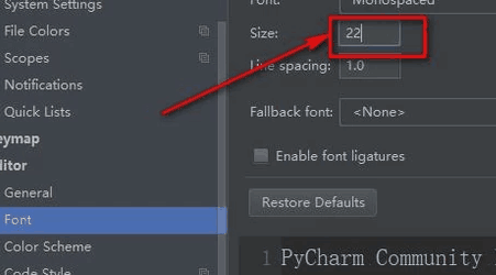 如果要修改代码的字体大小,则先找到“editor”选项,然后点击“font”,这个是设置代码字体大小的地方。