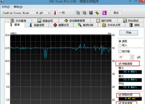完成基准应用检测后,我们就能在图表的右侧看到“传输速率、存取时间、突发速率和cpu使用率”等相关的数据结果,如下图所示: