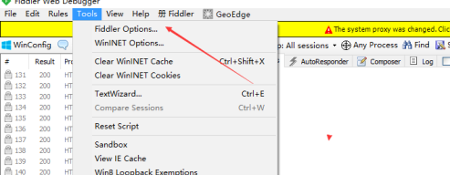 点击了tools菜单,弹出了下拉菜单选中为 fiddler options 选项