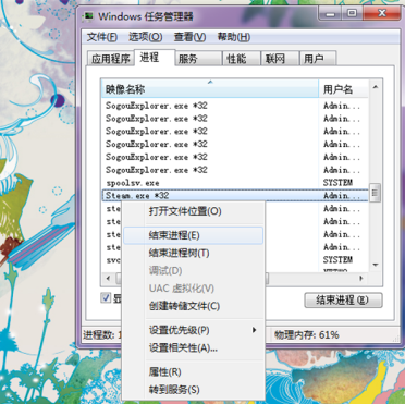 结束进程,让steam的应用程序结束。