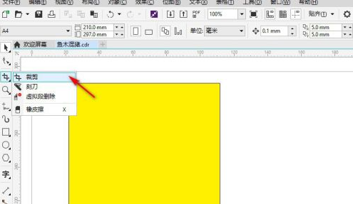 左键在“裁剪”工具上长按,选择列表中的“裁剪”命令,如下图所示,如果默认是裁剪,也可以直接点击选择。