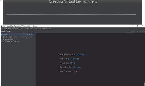 点击新建工程后,它会自动新建一个文件夹,根据需要对文件夹进行更名。我这里将他命名为first project。点击creat之后它就开始配置相关环境了,等一会配置成功之后就可以新建文件了。
