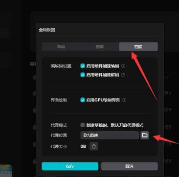 在全局设置界面,点击“性能”选项卡中的“代理位置”。
