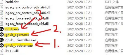 3、打开后,根据图示提示依次双击运行“lghub_updater.exe”、“lghub_agent.exe”和“lghub.exe”三个程序。(建议戴着耳机,听到有提示音才说明运行成功)