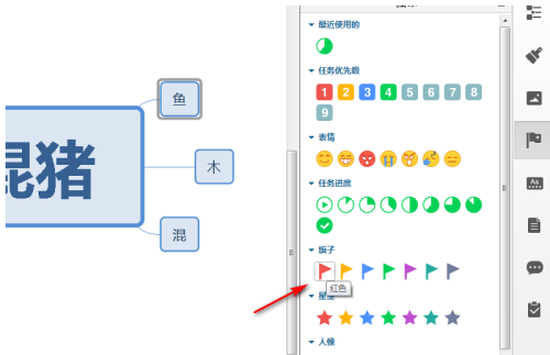 选择要添加图标的主题或者子主题,如果多个主题要添加同样的图标,也可以一起选中,然后点击右侧快捷工具栏中的“图标”,如下图所示。