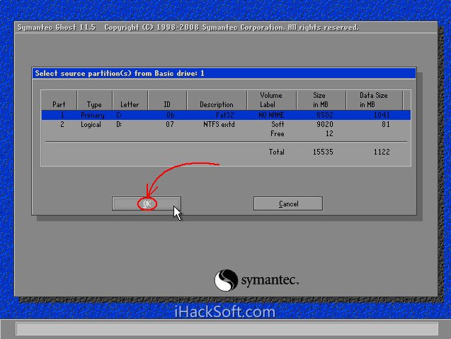 4、出现选择源分区窗口(源分区就是你要备份的那个分区),单击系统所在的分区(通常为1区,一定要弄准),再单击“OK”(如图所示)。