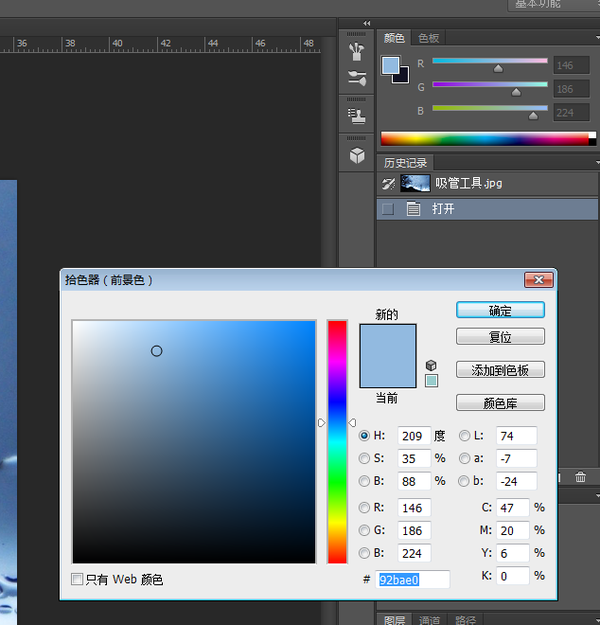 第五步:做到这一步后,我们所想要提取的颜色就出现在拾色器界面上了,而且我们也能看到相应的颜色属性数值等(如图所示)。