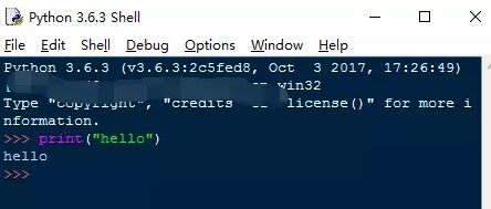 3、第一个程序就是打印print,我们在光标后面输入print("hello"),这样就能在下一行打印出hello(如图所示)。