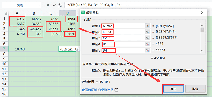 2.拉取“区域”“条件”“求和区域”的数据,点击“确定”(如图所示);