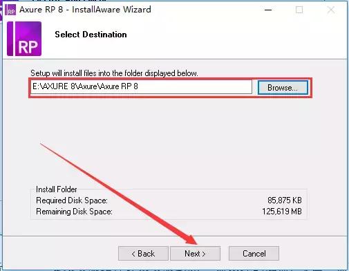 5、点击Browse更改安装路径建议安装到除C盘以外的磁盘,可在D盘或者其他盘创建一个Axure 8文件夹。然后点击Next(如图所示)。