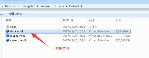 3、找到雷电模拟器损坏的文件夹,里面就会有data.vmdk文件,这就是模拟器的数据文件,如图所示。