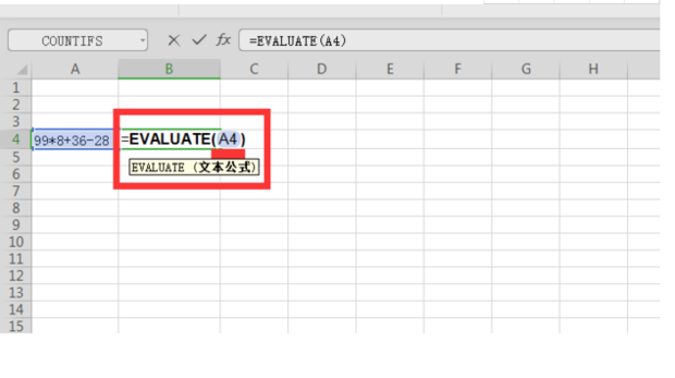第四步:在要显示结果的表格输入括号中的内容是算是所在的单元格,比如小编的算式在A4,就是=evalUATE(A4),如图所示。