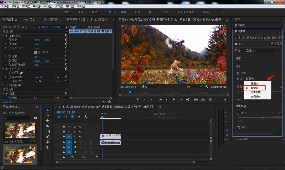 5、点击创意混响窗口,将预设设置为“轻混响”。