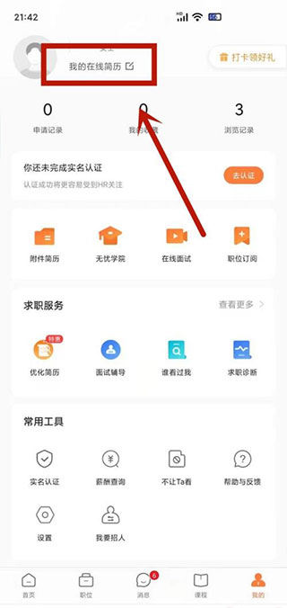 打开前程无忧后,点击首页右下角的我的。进入后,点击最上方我的在线简历。