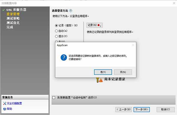 4、登录管理,点击“下一步”,提示“该选项需要您记录新的登录序列,或装入之前记录的序列,仍要继续吗?”,点击“是”;