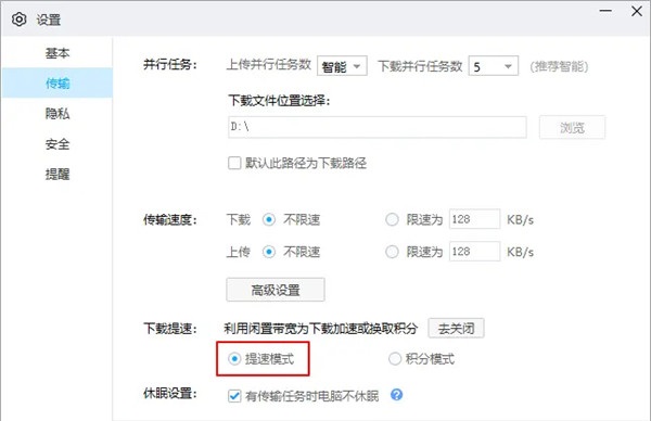 点击传输-下载提速-提速模式,点击后会提示是否开启,选择确定开启后就可以利用此模式获得较快的传输速度。