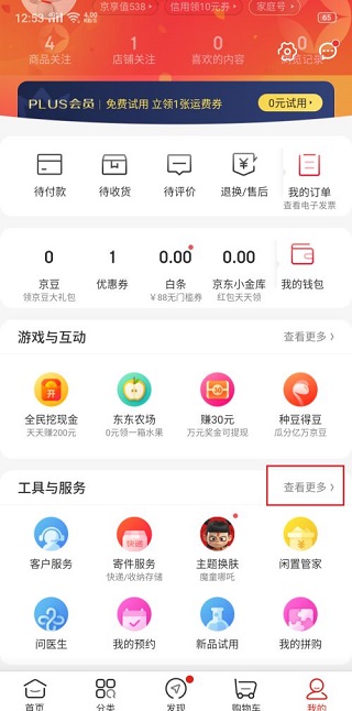 首先,我们需要在我们的手机上打开我们的“京东”APP,登录我们平时就进行购物的京东账号。登录完成后,我们可以在我们的主界面下方的提示条中,找到“我的”,点击进入我的界面,找到界面中的“功能与服务”
