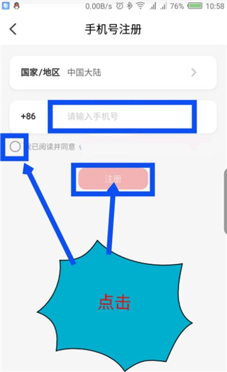 点击新用户注册后,打开手机号注册界面。输入注册用的手机号码,勾选我已阅读,点击注册选项。如图所示