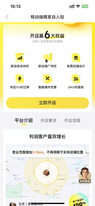 进入移动端商家入驻后,在这里可以查看开店要求、开店流程,当都满足后点击;