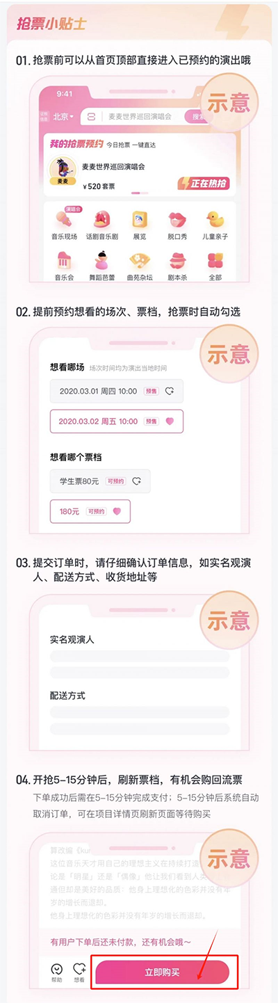 抢票前可以提早找个其他有票的演唱会进行演练一遍,只要最后不支付就没关系。抢票时要确保自己都已经设置好观演人和收货地址,注意实名观演人需打勾,配送地址是选好的,支付方式确认一下即可。