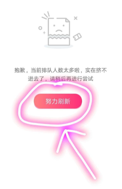 4、在点击中途,会变成另一个提示界面。界面提示“抱歉,当前排队人数太多啦,实在挤不进去了,请稍后再进行尝试”