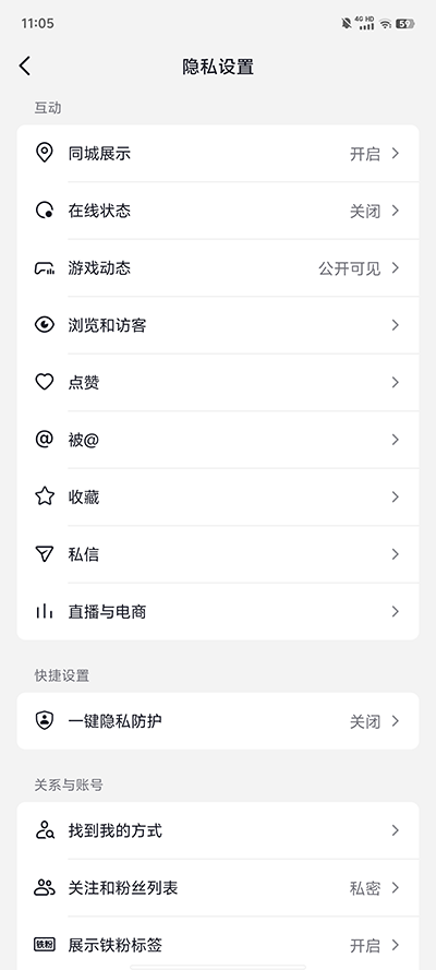 4、在“隐私设置”中找到“在线状态”或“展示在线状态”并点击。
