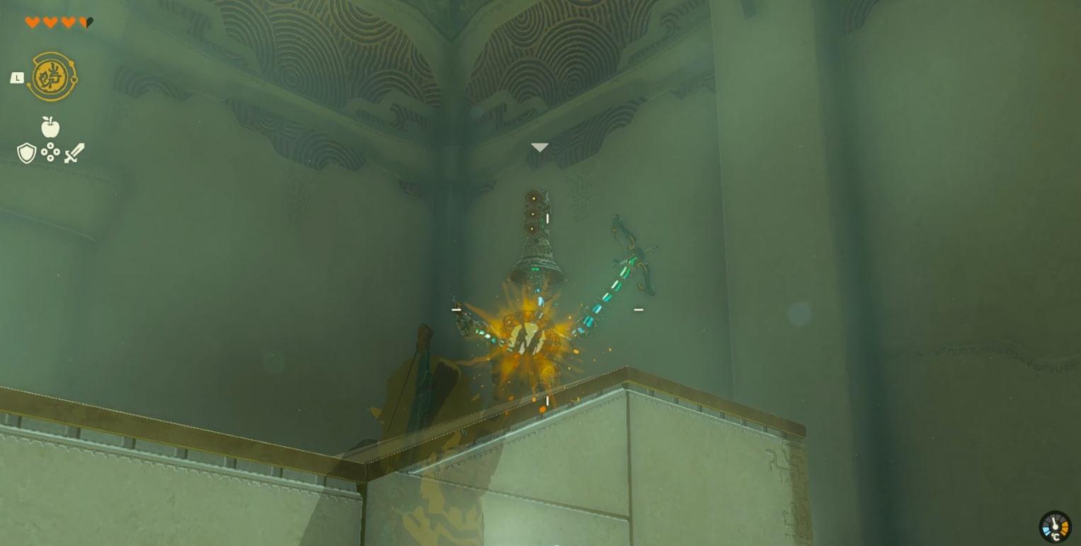 该神庙为战斗技巧练习神庙,在大厅中拿到火焰果后将其投掷向高台上的敌人。