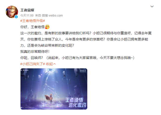 这一次的邀约,是有新的故事要讲给我们听吗?小妲己很期待与你重逢呀,记得去年夏天,你在赛场上惊艳了众人,今年是会有更多的惊喜吧?你是会让小妲己拥有更多能力,还是会为峡谷带来新的变化呢?