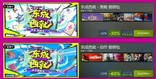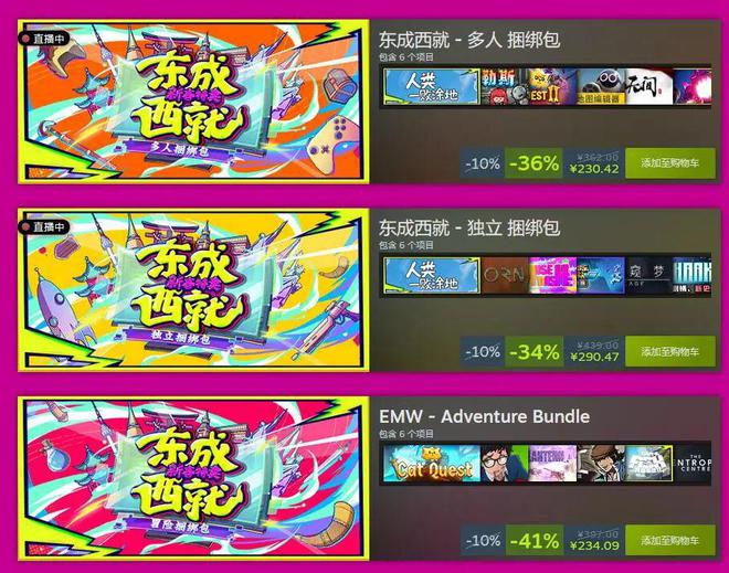 本次东成西就共为玩家准备了8个不同类型的捆绑包,分别为类Rogue、模拟、角色扮演、多人、独立、冒险、策略和动作。