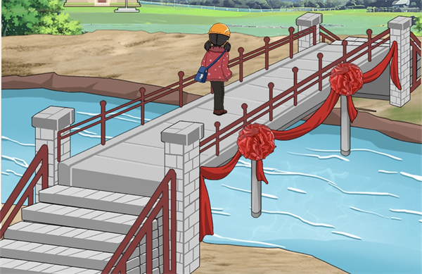 4、然后拖动护栏到桥上,再拖油漆,再拖动彩球到桥上剪彩。