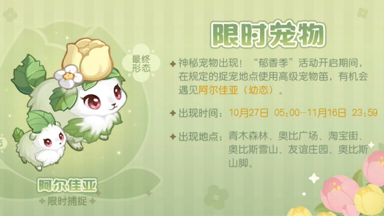 10月27日更新后-11月16日23:59,限定宠物「阿尔佳亚」将会出现在奥比岛,前往青木森林、奥比广场、淘宝街、奥比斯雪山等公共场景,使用召唤,就有机会遇见幼态的「阿尔佳亚」啦~