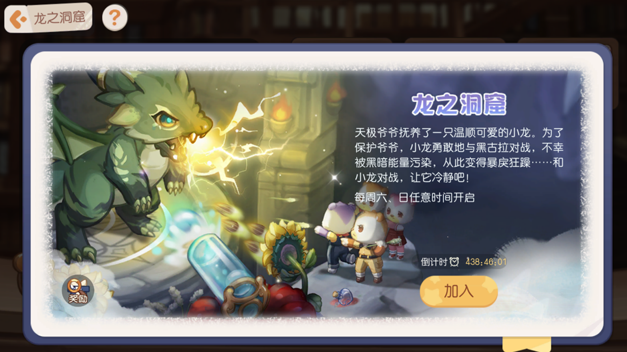 10月27日更新后的每周六日,家族龙之洞窟多人PVE玩法开启。温顺可爱的小龙绿炎,为了保护天极爷爷不慎被黑暗能量污染,变得暴戾狂躁。召集家族成员,一起前往龙之洞窟,和小龙绿炎对战,让它陷入沉睡吧。