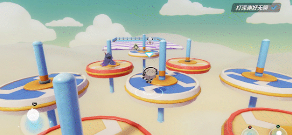 地图整体可以划分成三个阶段,先是经过第一阶段的移动平台,然后通过弹簧垫进入第二阶段的滚动履带,最后再来到第三阶段的转盘,通关流程比较线性,没有较多岔路的影响,比拼的是大家对关卡的熟练度。