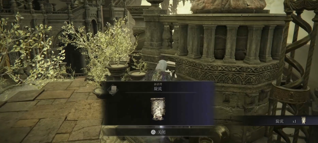 旋流是新增的一个攻击类型的祷告,它的效果很直观在使用时会将双手交叉紧握并高举指向天空,随后在锁定的敌人脚边召唤出一道向上旋转的光柱进行攻击。要是这里长按着施法不松开的话,就还能接着耗费专注值在敌人位置接二连三地形成多道这种螺旋光柱,以此打出一个短时间的连续伤害。这个祷告在DLC艾尼尔伊利姆那里的第一塔附近,注意有一点很关键就是这个区域需要自己先推主线,在达成了烧树之后才可以来这。