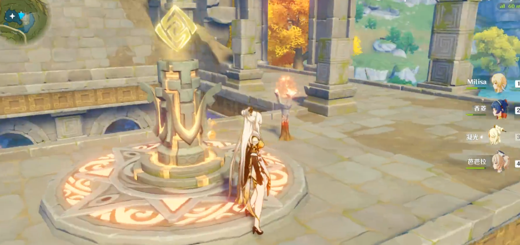在护送第三个仙灵的过程中需要注意,这个仙灵会先往二楼飞去,玩家需要从建筑外侧两旁的窗口爬进去继续跟随。当三个仙灵全部归位后,保护罩就会完全消失,这时候可以进入中央平台开启华丽宝箱,获得珍贵道具无名的宝藏。同时平台中央会产生风场,利用风场起跳可以拿到上方的岩神瞳,这是探索过程中不容错过的收集要素。