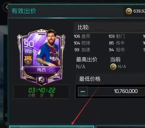 7.这个时候会跳出来有效出价对话框,如果玩家有足够多的游戏币,就点击左下角的立即购买这个选项,就能获得梅西了。