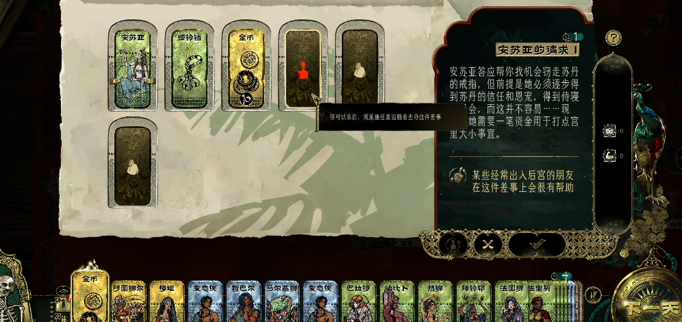 满足这个条件后巴拉特的相关事件链才会在游戏中出现,所以前期要有意识地通过管理领地、处理事件来积累这些属性,等到满足了剧情触发的条件后首先要干的就是用上奢靡卡。这里需要进入俺寻思的界面,然后把一张奢靡卡放进去进行操作,这个动作的结果是让自己获得一处房屋并将其出租。做完这一步后就需要耐心等待,直到游戏里出现异国商人相关的事件,接下来是获得关键道具哑铃铛。自己需要找到名为安苏亚的角色,并对她使用一张青铜级纵欲卡,这会触发一个叫做安苏亚妃来访的事件。