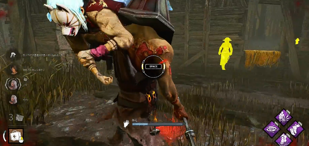 第三个技能挣脱激励则是一个典型的团队协作技能,它主要是特别适合开黑的时候用,这技能的效果分两部分:当自己处于被杀手搬运的队友6米范围内时,自身的移动速度会提升7%,同时队友在肩上挣扎时的速度会高20%。这个加速效果即使在疲劳状态下也依然有效,此技能存在的意义很明显,就是鼓励自己去贴紧扛人的杀手,然后进行所谓的卡位或挡刀,毕竟利用加速效果会更容易地追在屠夫身边,从而大幅增加队友挣扎下来的几率。